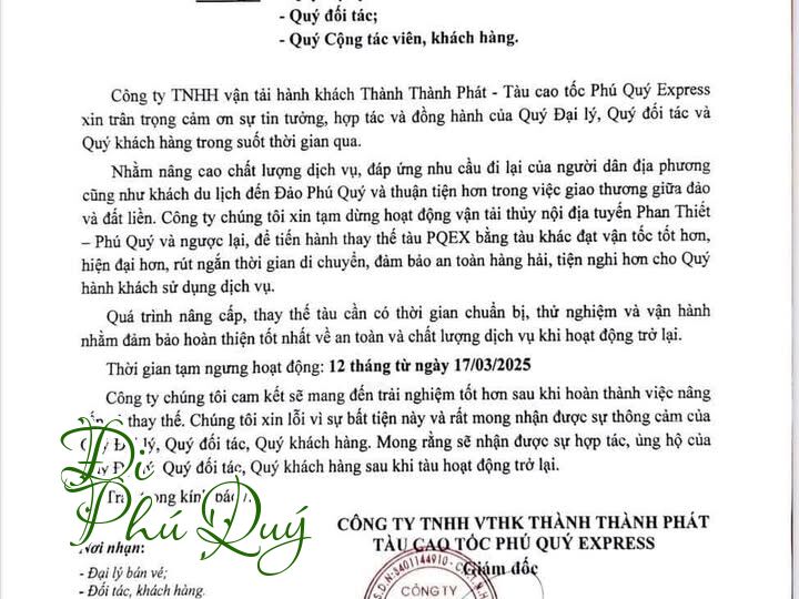 Thông báo Tạm ngưng khai thác tuyến Phan Thiết - Phú Quý và ngược lại của tàu Phú