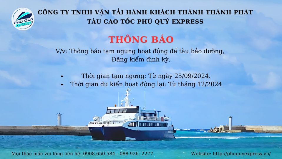 Nhằm đảm bảo an toàn và tuân thủ các quy định pháp luật liên quan đến hoạt động vận tải đường thủy, Công ty chúng tôi xin trân trọng thông báo về việc tạm ngưng hoạt động của tàu cao tốc Phú Quý Express để thực hiện công tác bảo dưỡng, Đăng kiểm định kỳ như sau: ...